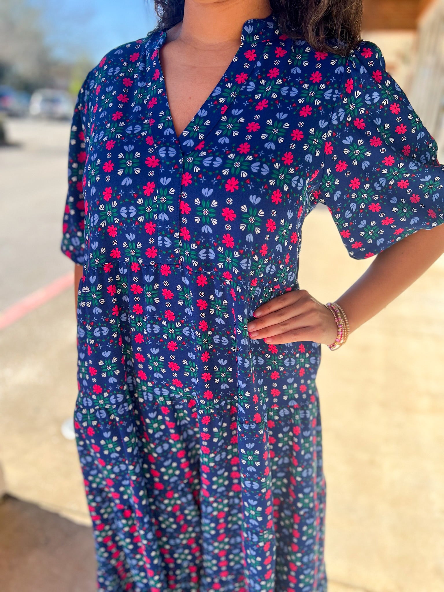 Navy Floral Tiered V-Neck Midi Dress