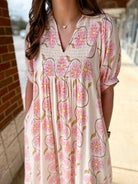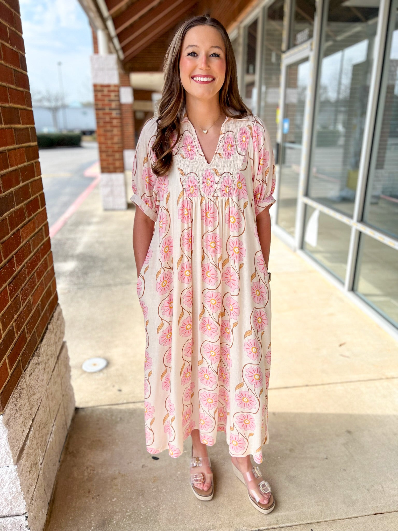 Ecru and Pink Floral V-Neck Midi Dress with Short Sleeves
