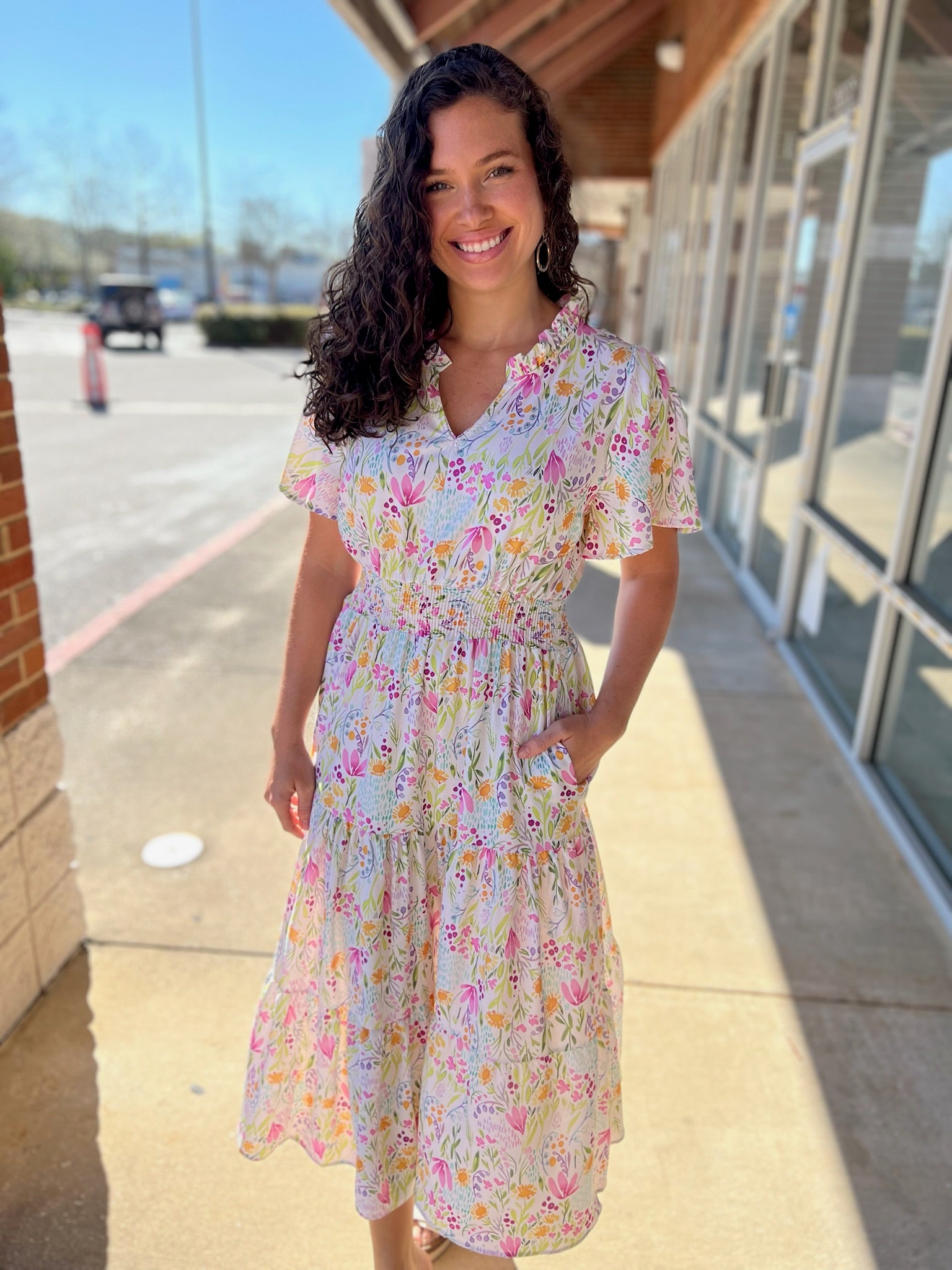 Ivory Floral Short Sleeve Midi Dress with Smocked Waist (R)