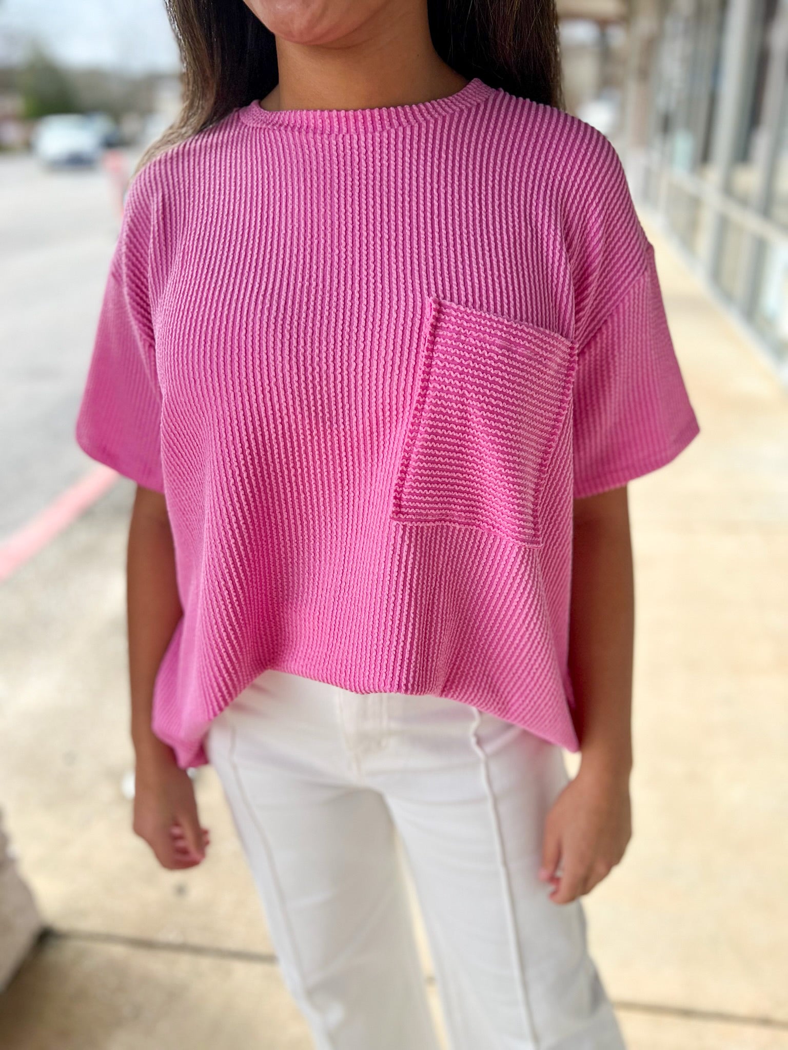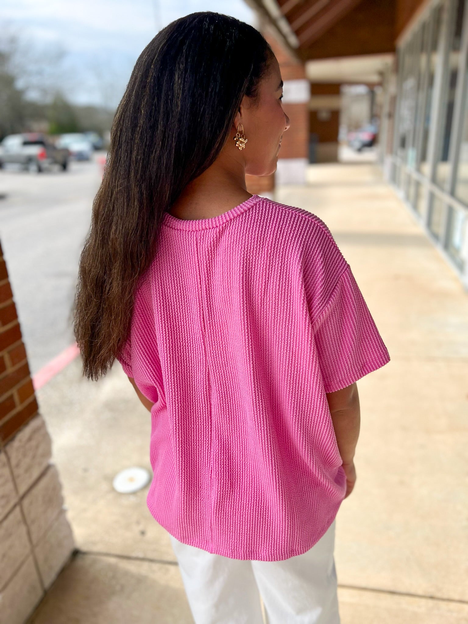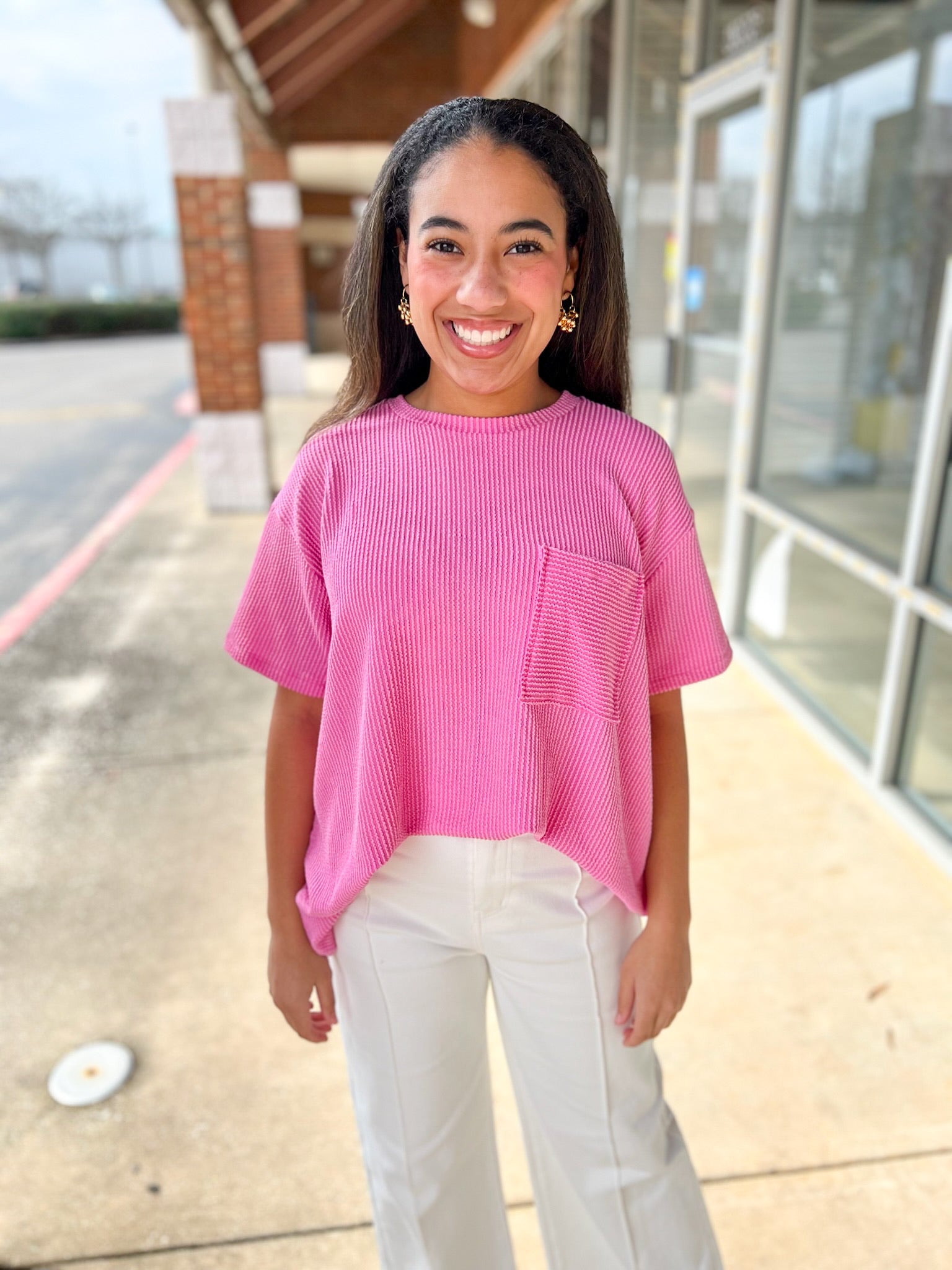 This candy pink raised ribbed short‑sleeve top brings an easy blend of texture and comfort. The wavy corded rib knit gives the fabric a subtle, dimensional pattern that feels both playful and elevated, while the relaxed fit keeps the silhouette effortless and laid‑back. A front pocket adds a casual touch, making the piece feel lived‑in and versatile.